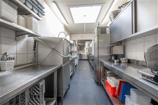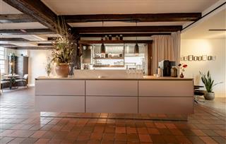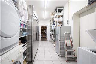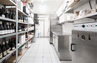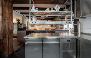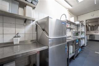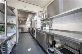 De keuken is ruim opgezet en biedt voldoende werkruimte voor een team van vijf koks. Ze bestaat uit drie ruimtes, waarvan de achterste ruimte afgescheiden is met klapdeuren. De keuken is volledig uitgerust voor een klassieke, complete restaurantkaart. Zo vind je er onder andere vier koelwerkbanken, een 4-pits gasfornuis, Rational combisteamer, salamander, bakplaat/plancha, dubbele koeling, enkeldeurs vrieskast, warmtebrug met lampen, bordenwarmer, glazenwasmachine met osmose en een professionele vaatwasser met waterontharder. Achterin is een aparte ruimte voor voorraad, met tevens een aansluiting voor een wasmachine.