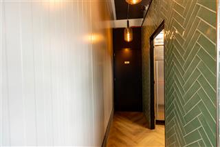 Bij binnenkomst wordt men direct verwelkomd in de verkoopruimte, waar de lange, uitnodigende bar onmiddellijk de aandacht trekt. Daarachter bevindt zich de moderne open keuken met een strakke afwerking, die zorgt voor transparantie en een levendige sfeer.