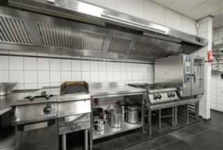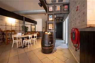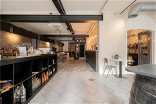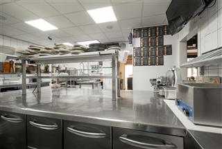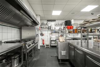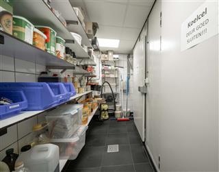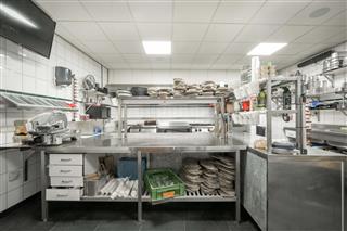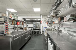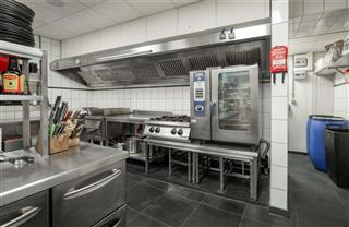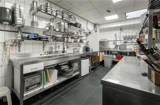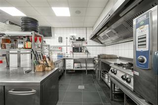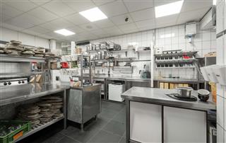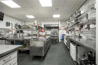 De ruime keuken biedt plaats aan een team van vier koks en een afwasser en is bereikbaar via de bar. Dankzij de twee doorgangen, gescheiden met een wandkast voor inkomende en uitgaande bediening, verloopt het werk efficiënt. Bij binnenkomst ligt de uitgifte direct voor je, rechts bevindt zich de spoelhoek, waar je ook kunt debarrasseren. De keuken is volledig uitgerust en beschikt onder meer over een etagère met een warmtebrug, vier gaspitten, een stoomoven, gasgrill, 25-liter elektrische friteuse, doorschuifvaatwasser, sous-vide apparaat, bain-marie, vacumeerapparaat, snijmachine, twee koelwerkbanken met vier deuren en een kleine vriezer. Achterin vind je bovendien een koelcel, vriescel en wandplanken voor extra opslag.