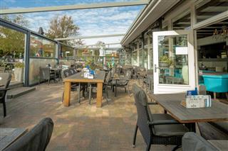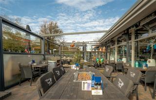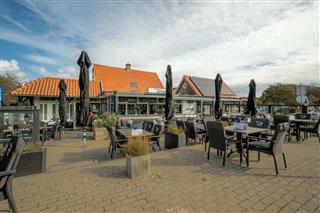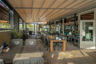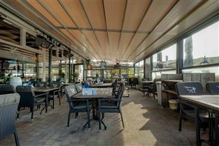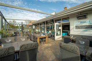 Het eerste wat opvalt, is het ruime, sfeervolle terras op het zuidwesten; vrijwel de hele dag zon dus én een geweldig uitzicht op de duinen! Met plaats voor 120 gasten is dit een regelrechte blikvanger. Het terras is ingericht met antracietkleurige stoelen en banken, houten tafels en oogt modern en comfortabel. De 10 parasols, 4 heaters en een vuurtafel maken het compleet. Vrijwel de helft van terras kan worden afgesloten. Van deze veranda kan het dak open en dicht en de windschermen aan de zijkanten zijn in hoogte verstelbaar. Zo kun je flexibel inspelen op het weer en is er altijd een plek waar gasten beschut én behaaglijk kunnen genieten van zon, zee en sfeer.
