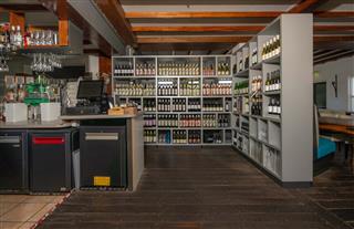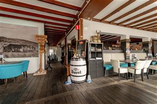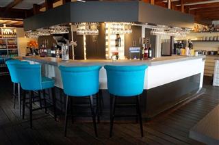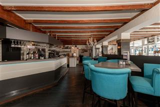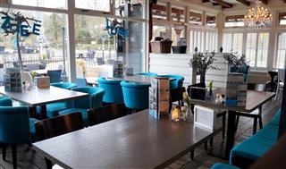 Hoewel er ook aan de zijkant een ingang is, komen de meeste gasten via het terras het restaurant binnen. Daar is plaats aan nog eens 120 gasten, gelijk verdeeld over het voor- en achtergedeelte van de zaak. De turquoise tinten in het interieur zorgen voor een frisse, sfeervolle uitstraling die perfect past bij de ligging, zo dicht bij zee en strand. De inrichting is een mix van comfortabele zitplaatsen en enkele hoge tafels met barkrukken, die duidelijk populair zijn bij de gasten. Blikvanger in het hart van de brasserie is de centrale bar. Dit is een volledig uitgeruste uitgiftebar met een warme en koude hoek, met onder andere 2 koffiemachines, 4 tapkranen, een Chocomel-apparaat, koppenwarmers, slagroomautomaat, ijskoffiemachine, glühweinmachine, osmose glazenspoelmachine, sinaasappelpers, barkoelingen, vacuümmachine voor wijnflessen en uiteraard een kassasysteem. Echte eyecatchers zijn de stijlvolle wijnkasten, die niet alleen functioneel zijn, maar ook bijdragen aan de warme en eigentijdse sfeer in de zaak.