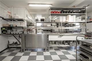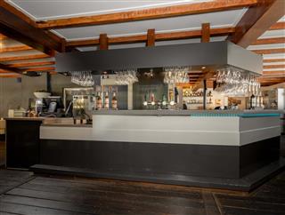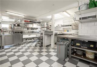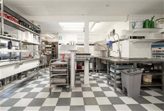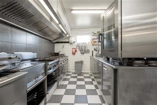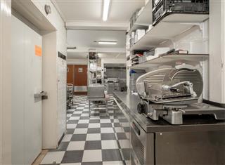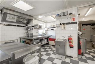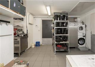 De keuken is opvallend groot en efficiënt opgezet, met toegang via het middengedeelte van de bar en langs beide zijden. Ze is verdeeld in een warme kant, koude kant, spoelruimte en beschikt over 2 koelcellen, waarvan één directe toegang biedt tot een vriescel. De keuken is uitgerust met professionele apparatuur zoals een Rational steamer, 8-pits gasfornuis, bakplaat, twee friteuses, een visfrituur, warmtekast, twee au bain maries, saladière, twee koelwerkbanken, een vrieswerkbank, warmtebrug en een vaatwasser. Hierdoor kan efficiënt en veelzijdig worden gewerkt. De bevoorrading vindt plaats via de achterzijde van het pand, waar tevens het magazijn is. Hier bevindt zich ook een snackbar, die door een derde partij wordt geëxploiteerd.