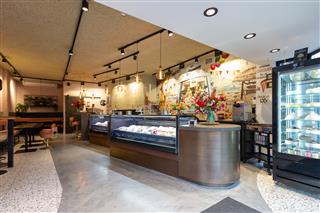 De ijssalon beschikt over een schuifwand aan de voorzijde, waardoor de winkel volledig geopend kan worden en een open, uitnodigende sfeer creëert. Bij binnenkomst wordt men direct verwelkomd in de verkoopruimte, waar de hoogwaardige ijsvitrine aan de rechterzijde onmiddellijk de aandacht trekt. Deze prachtige ijsvitrine zorgt voor een optimale presentatie van het assortiment. Een vitrine vol verleidelijke kleuren en smaken, uitnodigend voor elke bezoeker. Aan het einde van de vitrine bevindt zich de espressobar met zitplaatsen waar gasten kunnen genieten van verse koffie.