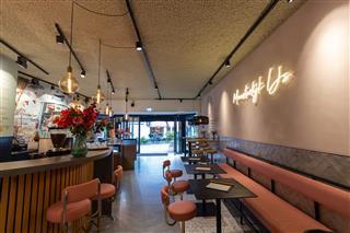 De verkoopruimte is ca. 60 m² en is sfeervol ingericht met diverse zitmogelijkheden, waaronder twee hoge houten tafels met vintage krukken, een lange bank met stalen onderstel, mooie tafels met vintage krukjes en een cosy corner met bank en stoelen. Alle meubels zijn vervaardigd uit hoog-waardige materialen, wat bijdraagt aan een stijlvolle en duurzame uitstraling en plaatst biedt aan circa 23 gasten.