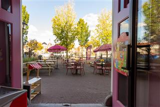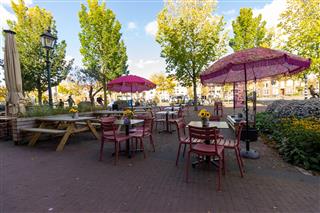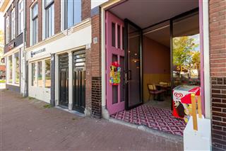 Aan de voorzijde van het object bevindt zich het ruime terras gelegen op het plein, met maar liefst ca. 40 zitplaatsen. Bij goed weer kunnen kinderen hier ook buiten spelen, terwijl ouders genieten van de zon en het uitzicht op de gracht. Het kidscafé is te betreden via twee openslaande deuren. Doordat er een tocht portaal is gecreëerd met een glazen tussendeur, staan de voordeuren altijd open, wat een uitnodigende uitstraling geeft.
