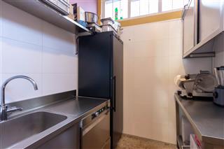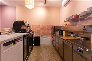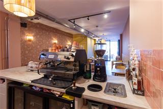 Achter in de zaak bevindt de toonbank voorzien van professioneel horeca inventaris, zoals een koel-werkbank, koffiemachine en oven. Aan de rechterzijde zit een doorgang naar de productieruimte achter en het toilet.