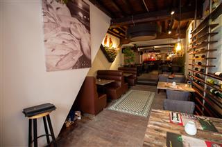 Achter de bar loopt het restaurant nog door met grote tafels omringd door een grote leren bank en aangevuld met stoelen, hier is plek voor groepen van in totaal ongeveer 20 personen. Ook zijn in deze ruimte de gescheiden toiletten te vinden.