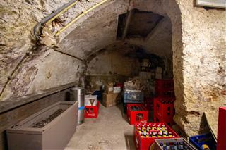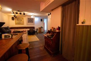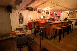 Na het tweede opstapje bevindt zich aan de linkerzijde van het restaurant de logisch geplaatste bar met een tapkraan, koffiezetautomaat, spoelbak en een counter. Voor de bar zit ook een luik in de vloer die leidt naar de kelder waar nog ca. 25 m2 aan opslagruimte zit.