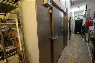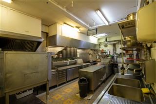 De ruime keuken (ca. 50 m2) is toegankelijk via een deuropening rechts achterin het restaurant. De gehele rechterzijde is voorzien van werkbank en apparaten. Halverwege, aan de linkerzijde van de keuken, zit een ruime koelcel met daarachter een extra opberg /voorraad ruimte
