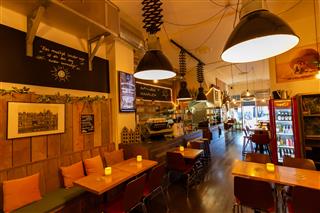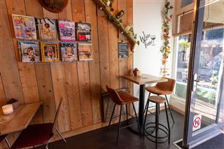 Aan de voorzijde van het object bevindt zich het ruime terras met ca. 20 zitplaatsen. Via het terras wordt de verkoopruimte binnen bereikt. Bij binnenkomst via de deur in het midden van de glazen pui valt de knusse sfeer op, dankzij de warme kleuren, het meubilair en de natuurlijke materialen die zijn gebruikt. Aan weerszijde van de verkoopruimte staan diverse tafels en stoelen opgesteld.