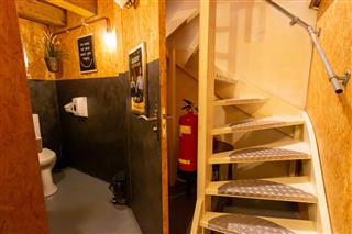 Net voor de bar bevindt zich een trap naar de toiletgroepen en een opslagruimte in het souterrain. De ruime opslagruimte biedt de mogelijkheid om grotere voorraden aan te houden. Ook is er een personeelstoilet.