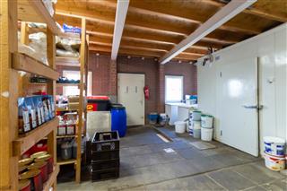 Vanuit de entree bevindt zich links achterin het zitgedeelte de toegang tot de gescheiden toiletten. Rechts achterin, via de keuken, is de doorgang naar de achtergelegen productieruimte en de spoelkeuken. Via een trap naar beneden leidt deze ruimte naar een ruime opslagplaats en een inloop koelcel. Deze opslagruimte is ook bereikbaar via de achtergelegen straat, wat ideaal is voor het afvoeren van afval en het bevoorraden door leveranciers.