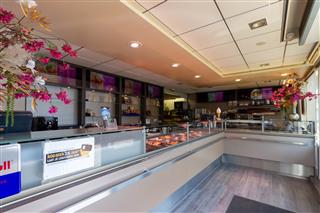 Via twee openslaande deuren aan de Edammerweg wordt direct de cafetaria betreden. Bij binnenkomst loop je tegen de ruimte counter aan, waardoor de klanten gelijk kunnen worden geholpen. De counter is ruim opgezet in een L-vorm en voorzien van koelvitrines, met daarin de dagverse producten uitgestald, waarvan het water je in de mond loopt.