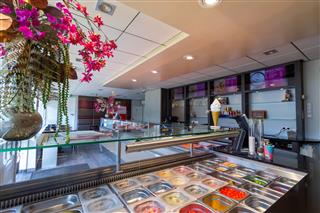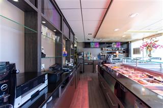 Aan de linkerzijde zijn diverse stoelen, banken en tafels opgesteld, waar de klanten kunnen plaatsnemen om te genieten van al het lekkers dat uit de keuken komt. Door de deels open-keuken kunnen de klanten zien hoe de maaltijd wordt bereid terwijl ze wachten. En vanwege de grote raam-partijen aan de voorzijde van het object valt er veel licht naar binnen en is er een uitstekend uitzicht op de drukke en levendige straat.