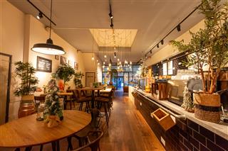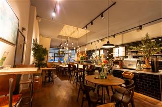 Bij binnenkomst bevindt zich aan de voorzijde het lichte en open zitgedeelte, waar grote raampartijen zorgen voor veel daglicht en uitstekend zicht op de dynamiek van de Haarlemse binnenstad.