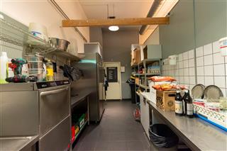 Links achterin leidt een deuropening naar de achtergelegen bereidingskeuken, voorzien van voldoende opslagruimte en extra horeca-inventaris. Via deze ruimte is ook het souterrain van circa 50 m² bereikbaar, wat momenteel niet tot het gehuurde behoort en niet gebruikt wordt, maar met beperkte aanpassingen wel geschikt kan worden gemaakt als extra opslag- of werkruimte (i.o.m. verhuurder).
