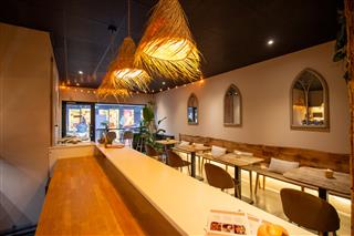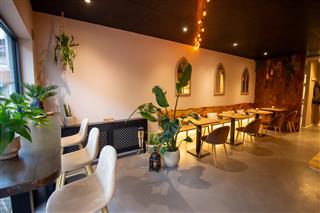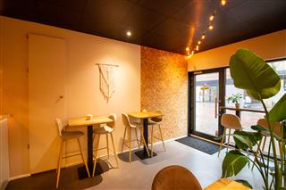 Aan de voorzijde bevindt zich een hoge tafel met krukken, ideaal voor gasten die snel willen aanschuiven voor een hapje of drankje. Aan de rechterzijde van de ruimte is de bar gesitueerd, die doorloopt richting de keuken en zorgt voor een efficiënte en overzichtelijke indeling met directe interactie tussen gast en bediening. Aan de linkerkant is een bank langs de gehele wand gerealiseerd met daarbij meerdere tafeltjes en stoelen.
