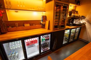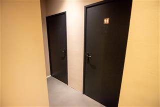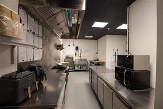 De afgesloten keuken is praktisch ingericht en biedt volop werk- en opslagruimte, zonder afbreuk te doen aan de beleving in het gastengedeelte. Voor de gedeeltelijke afsluiting van de keuken ten opzichte van het zitgedeelte is een beweegbare muur neergezet. Deze zou eventueel eenvoudig kunnen worden verwijderd voor het realiseren van een andere indeling. Centraal in het object zijn de gescheiden toiletten gesitueerd.