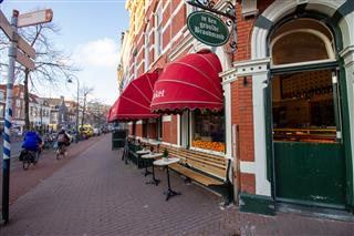 Buiten bevindt zich het gevelterras met ongeveer 20 zitplaatsen. Dit is bij uitstek de plek om met lekker weer neer te strijken. Vanaf het terras is de bruisende levendigheid van de stad goed te zien; het is een komen en gaan van fietsers en voetgangers.
