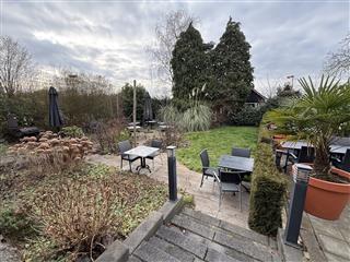 Buiten bevinden zich meerdere terrassen (met uitbreidingsmogelijkheden) en een fraai aangelegde tuin. Centraal in het pand ligt een ruime, nagenoeg complete professionele keuken met wasstraat. In de naastgelegen schuur zijn zeer ruime koel- en vriescellen aanwezig.