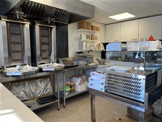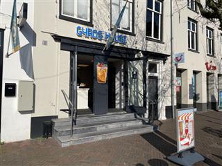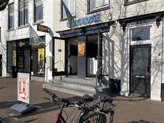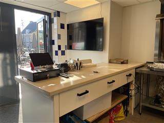 Via de trendy entree bereikt u de verkoopbalie. Aan de linkerkant hangt een tv en aan de rechterkant staat een koelkast met diverse frisdranken. Achter de verkoopbalie bevindt zich de volledig uitgeruste keuken. Rechts van de keuken bevindt zich een toilet. Naast de koelkast bevindt zich de meterkast.