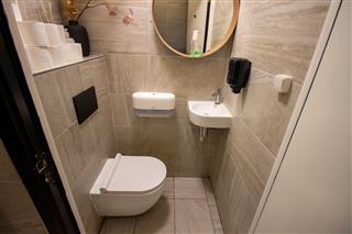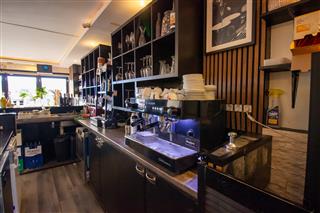 Aan de voorzijde, langs de ramen, zijn zitplaatsen gesitueerd. Aan de linkerzijde bevindt zich de bar, uitgerust met onder andere een tapkraan, koffiezetapparaat, spoelbak en werkruimte. Zowel vóór als achter de bar zijn tafels geplaatst, wat zorgt voor een efficiënte indeling.