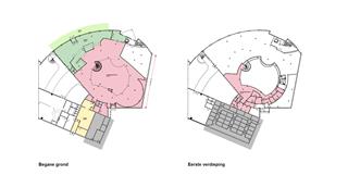 De bedrijfsruimte omvat 970m2 op de begane grond en 215m2 op de etage (groen, roze en geel gearceerd op tekening). De ruimten in het gebouw is in gebruik samen met Admiral Casino (niet gearceerde ruimten op tekening).