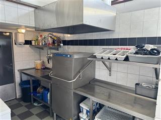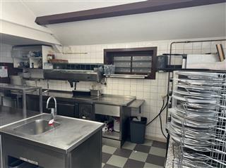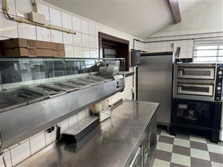 Professionele keuken voorzien van bakwand, oven, koelwerkbanken, vriezers, koelcel, pizza steenoven etc. Aparte frituurwand voor verkoop snacks met uitgifte.