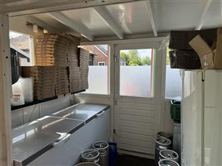 Professionele keuken voorzien van bakwand, oven, koelwerkbanken, vriezers, koelcel, pizza steenoven etc. Aparte frituurwand voor verkoop snacks met uitgifte.